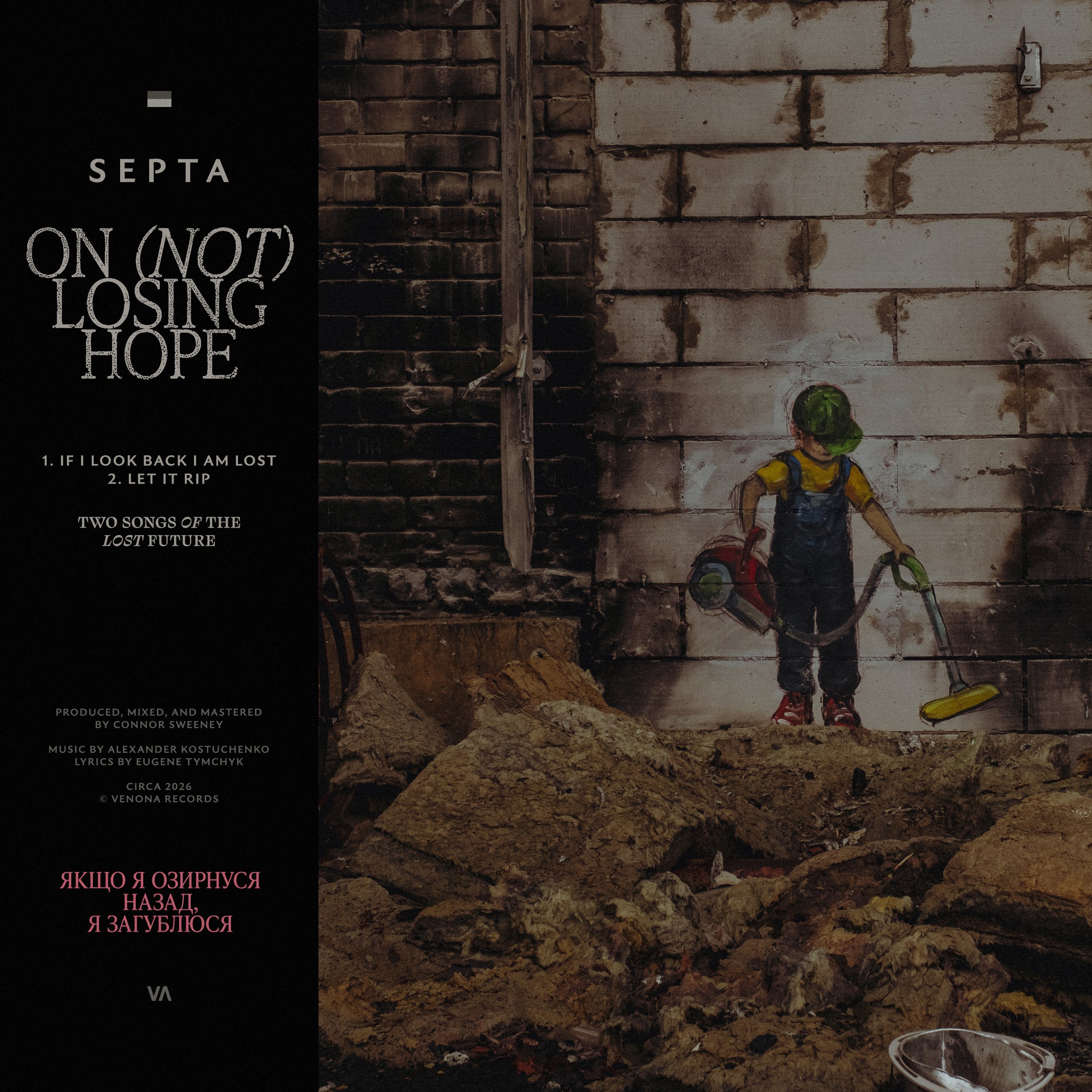 Septa was formed in 2010 in Odesa, Ukraine, by vocalist Eugene Tymchyk and guitarist Alexander Kostuchenko — driven by the conviction that metal music can be fierce and intelligent, brutal and romantic at the same time. After years of writing and touring, the band entered the studio with producer Matt Bayles (Norma Jean, Mastodon) to record their debut. The Lover (2013) combined post-rock, alternative metal, and post-hardcore into six songs that gathered critical acclaim and a devoted following. The follow-up, Destroyer (2014), took a darker turn — heavier and more brooding, drawing from mathcore and hardcore while expanding the band’s sonic palette. Years of extensive touring and writing led to Sounds Like Murder (2016), a one-hour collection of thirteen songs that instantly became one of the best-selling Bandcamp albums of its release month, dominated Ukrainian streaming charts, and was named Best Ukrainian Metal Album at the annual BUMA awards. Following opening shows for Stone Sour in 2019, the band regrouped around an ambitious new concept — a time-traveling Golem navigating themes of persecution, climate collapse, and human extinction. Bitten by the Serpent of the Kingdom of the Spirit (2019) is Septa’s most theatrical and intense record — a full-blown extreme metal concept album that reaches into progressive and art music territory without ever losing its restless experimental spirit. Its opening track Emet was later selected for the official in-game radio of S.T.A.L.K.E.R. 2: Heart of Chornobyl (2024), introducing Septa to millions of players worldwide. When russia launched its full-scale invasion of Ukraine in 2022, Septa found themselves searching for a way to make music that meant something in impossible circumstances. On (Not) Losing Hope (2026) is the result — two songs recorded during wartime, produced by Connor Sweeney (Loathe), that capture the band’s collective state of mind with raw honesty. This is what hope sounds like when it has no good reason to exist.